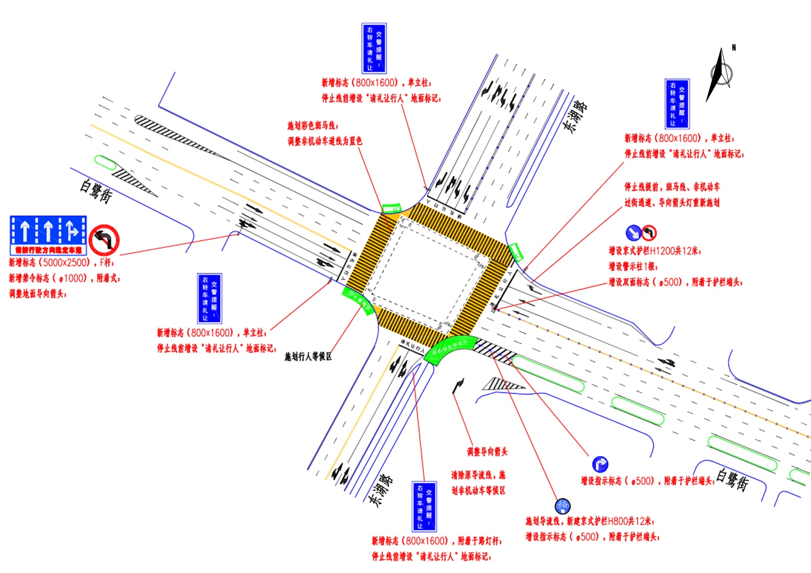 武昌区的东湖路白鹭街将制止东西方向左转,在人行道上施划行人等候区,过街斑马线变五颜六色,各进口新增右转车辆礼让行人标牌,施划“请礼让行人”地上符号;东出口加油站方位新增导向线和护栏。