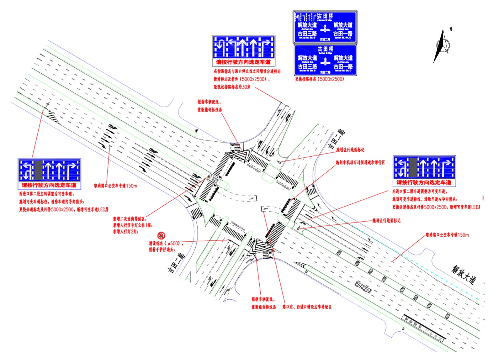 解放大路古田二路将对东进口第二股车道调整为左转,并施划左转待行区;将西进口设置可变车道,进步通行功率;削除部分斑马线,新增非机动车过街通道和禁行区;路口西新增二次过街等。