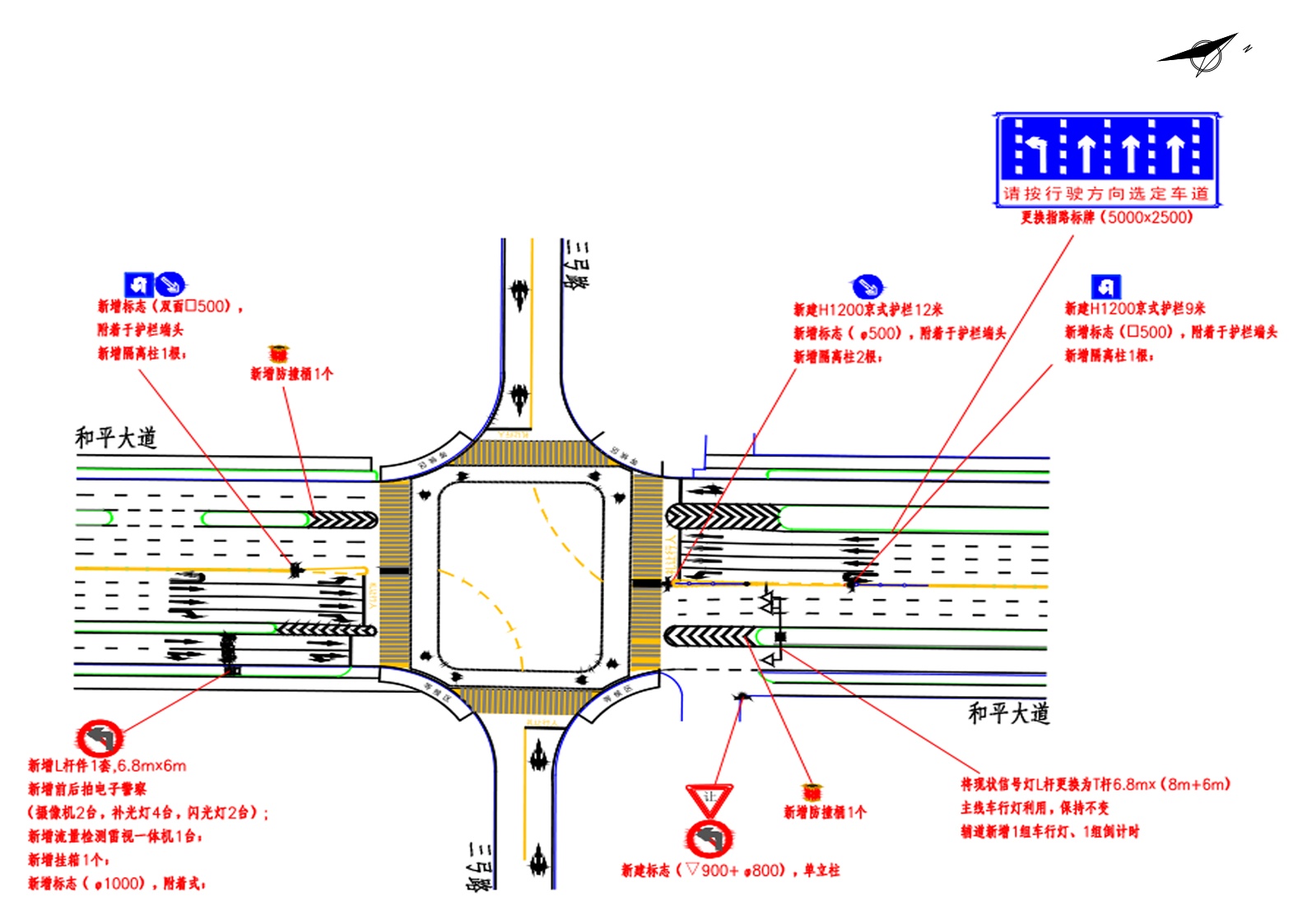 平和大路版图四路的东、西进口将替换人行信号灯;南、北进口中止线后移,完善标线;东西方向绿化带端头增设防撞桶;东西方向中心护栏端头增设靠右行进标牌等。