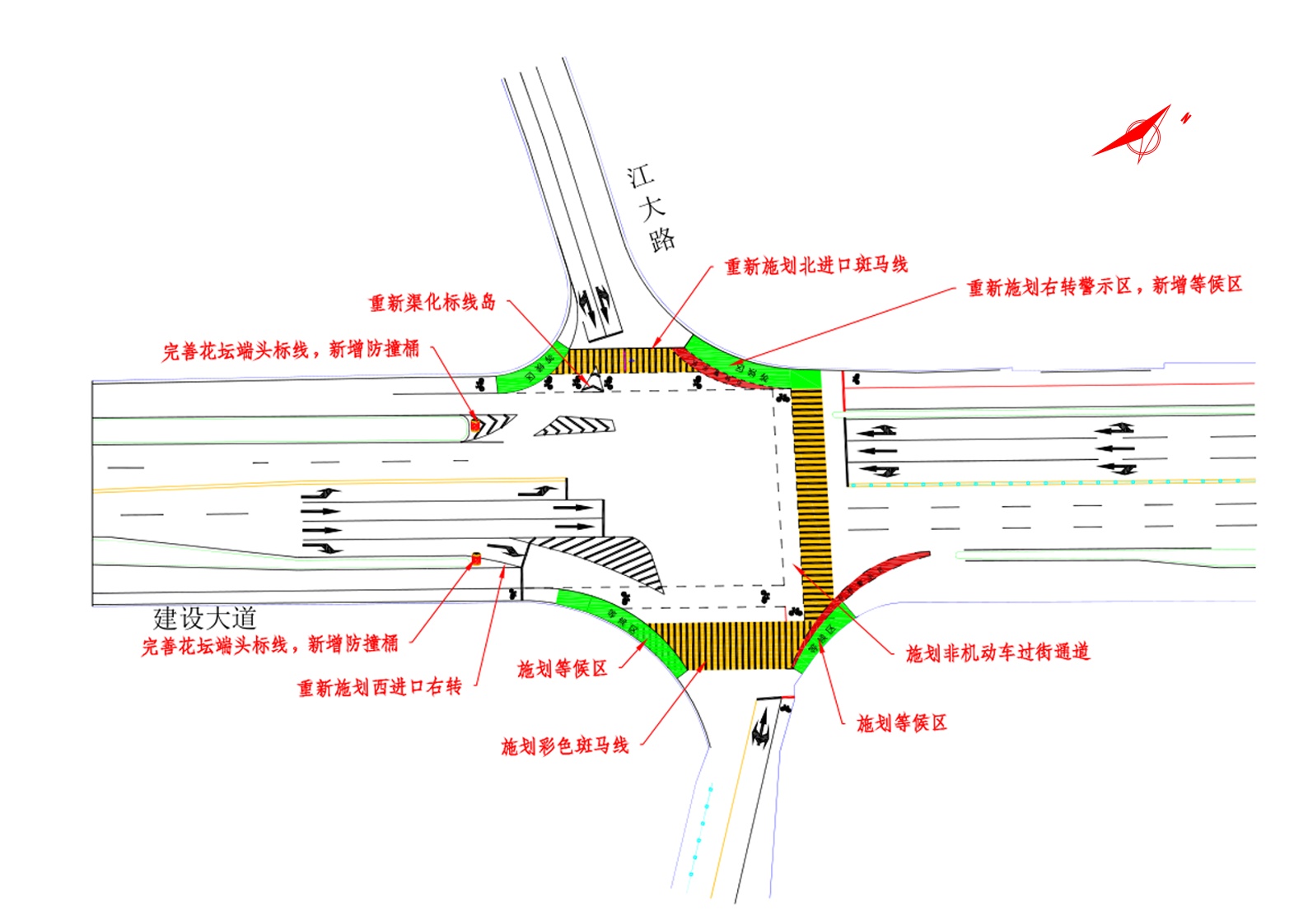 版图大路江大路的西进口和西出口的护栏端头,将添加施划导流线,新增防撞桶;依据车流轨道,从头渠化北进口标线岛,给出东进口直跋涉辅道的空间;从头施划东北角右转警示区,给出等候区空间。