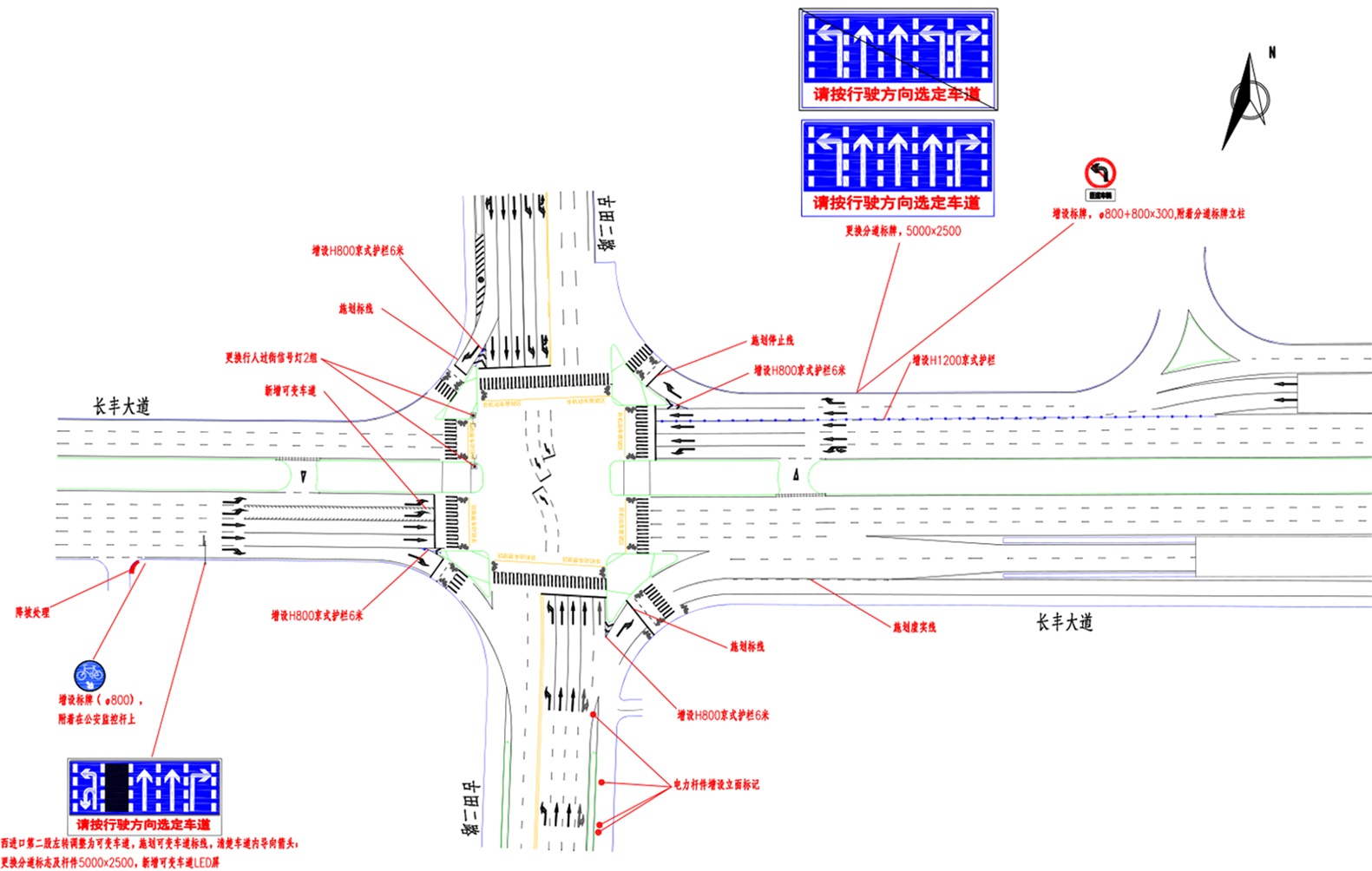 长丰大路古田二路东出口将设置虚实线,切割车道,削减交错,标准车流轨道;西进口第二股左转调整为可变车道,东进口北侧第二股车道设置护栏,制止高架层车辆左转,并在丰美路西出口新增指引标牌。