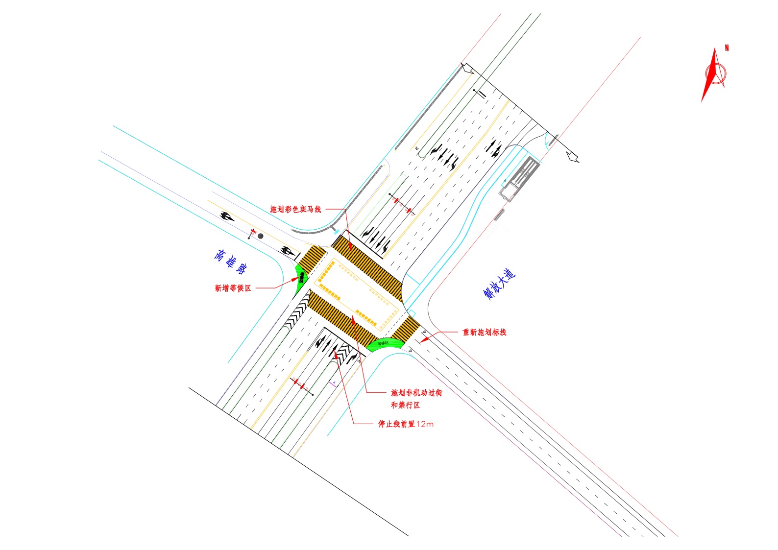 为便利行人和非机动车过街,该路口将施划非机动车过街通道和禁行区,对较高的路缘石进行降坡,进步通行舒适性等。